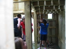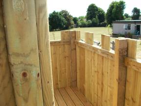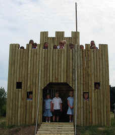 This hand-made, solidly built, two-storied castle has a sustainable treated timber frame clad with half round poles and stands 3.6 metres tall to the top of its inner tower. It’s footprint measures 3.5 by 3.5.metres. The lower level is entered by a static lowered drawbridge and is open-plan with room for adults to stand upright under the central open tower. The tower incorporates a pole for the school flag. The castle’s upper level, reached by integral wooden stairway and has a decked walkway on three sides. Narrow archers windows are made in three of its crenellated walls and small viewing windows on either side of the arched doorway on the lower level. This castle is only £6,500 but as the castle is hand-made on site, size can be tailored to your needs. Price includes delivery and installation. Please contact Liz on 01903 261191 or drop us an e-mail to discuss your needs. |
