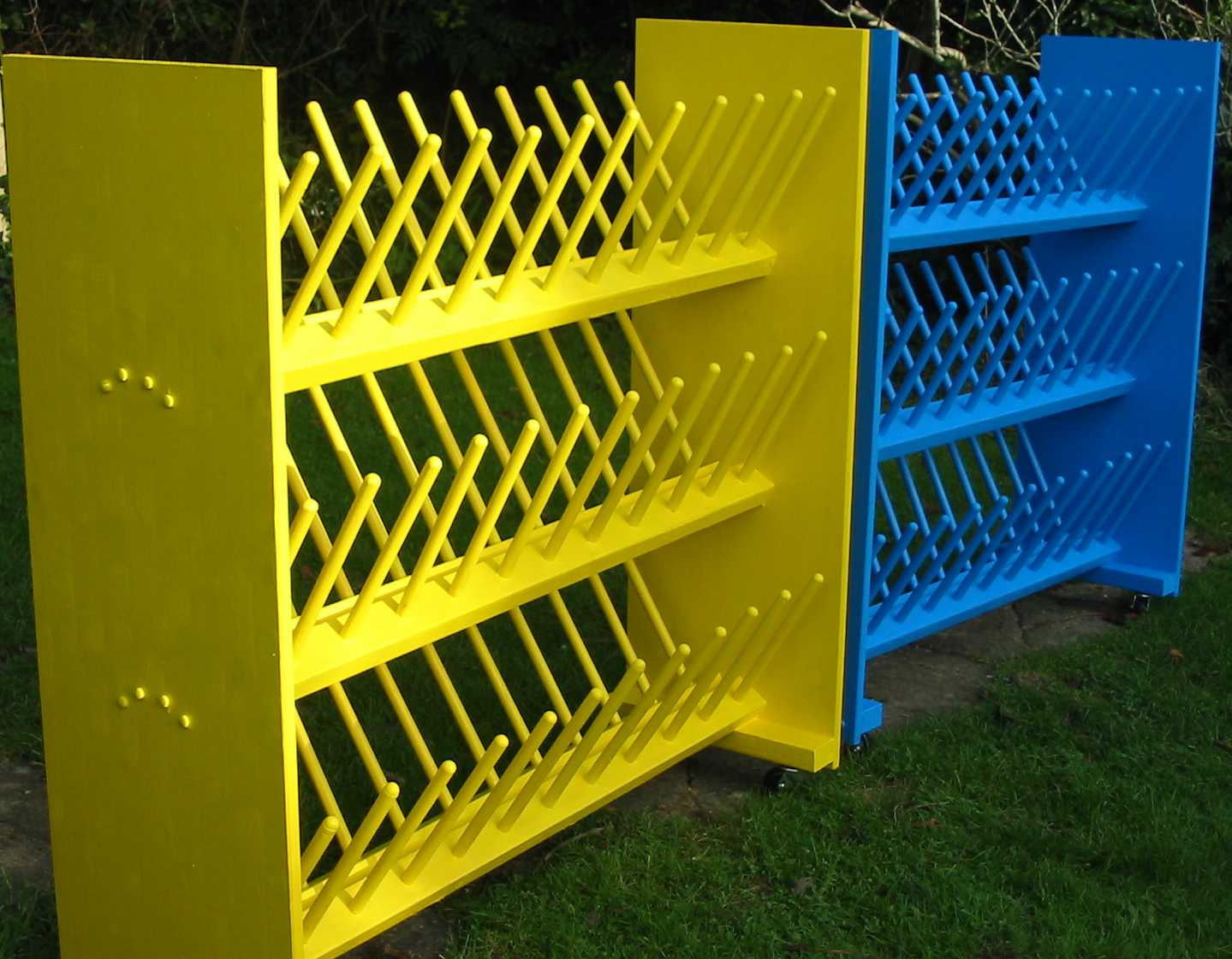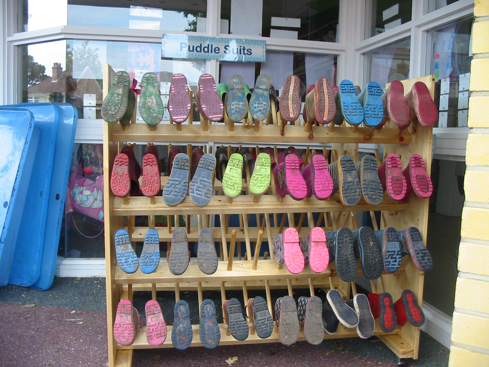 Our Wellington boot racks are ideal for schools or nurseries that want the children to spend some time outdoors all year round. The Infants and Juniors rack takes 36 pairs of Wellingtons which is large enough for the biggest classrooms and the Nursery rack takes 48 pairs. The racks are mounted on wheels so they can be stored outside the classroom during the day and then taken in at night. So no more clutter in the classroom! The standard models are 400mm deep, 1220mm wide and 1220mm high. However, we can make them to any size and shape you require. Prices from £380 for a 36 pair rack and £450 for a 48 pair rack. If you want to leave the racks outside, we can coat them with an exterior coating of a single bright block colour (red, blue yellow green) for an additional £60 per rack. All prices are subject to delivery (free if inside Sussex) Please contact Liz on 01903 261191 or drop us an e-mail to discuss your needs or place an order.